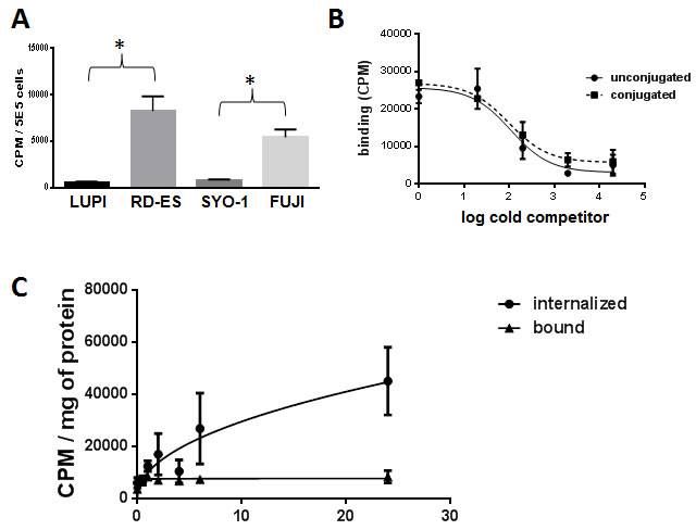 Cells were grown to ~50% confluence in 6-well tissue culture plates and incubated with 1-2 µCi (0.5 µg) of radiolabeled Ontuxizumab in 500 µL of complete media for 35 min at 37°C. Unbound antibody was removed by washing cells thrice with PBS. Cells were then solubilized in PBS containing 0.1% SDS, the lysate was transferred to microfuge tubes and cell associated activity detected with a gamma-counter. Extra wells with untreated cells corresponding to each cell line were assessed for cell number and used as reference. The results were expressed as counts per min per 5 x105 cells (CPM/5x105 cells).