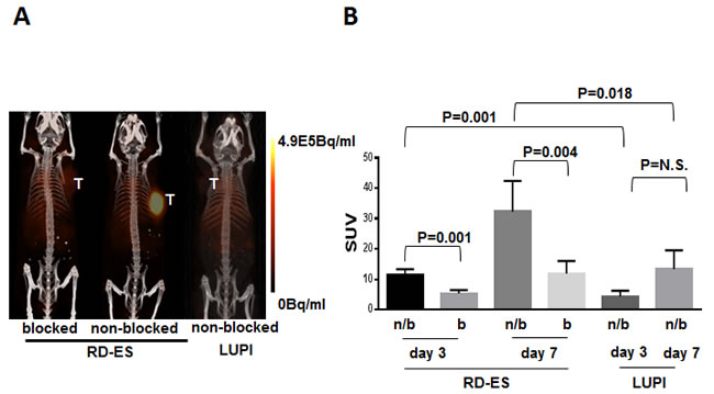 Figure 4: In vivo PET Imaging / Radiopharmaceutical tumor uptake. A. Maximum intensity projections (MIP) of PET/CT images at 72 hours post-injection of 100 µCi (50 µg) 89Zr-Df-Bz-NCS-Ab. Signal intensity adjusted to equal scale. All data are presented as mean +/- standard deviation. B. Standard uptake values (SUV) obtained from PET/CT image analyses performed at three and seven days post injection. Day 3: RD-ES = 7 for block (b) and non-block (n/b), LUPI = 3. The same n for day 7.
