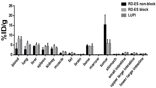 Figure 5: Biodistribution. Post PET (Day 7) biodistribution of 89Zr-Df-Bz-NCS-Ab for mice bearing RD-ES (N = 4) and LUPI (N = 3) xenografts. Data is presented as % ID/g. Blocked animals (N = 4) were pre-administered with 1 mg of native antibody to confirm specificity of targeting. All data are presented as mean +/- standard deviation.