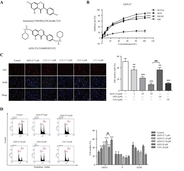 Figure 1: GEN-27 inhibits proliferation of human colorectal carcinoma cells. A. The chemical structure of genistein (GEN) and genistein-27 (GEN-27). B. HCT116, HT29, SW620 and FHC cells were seeded into 96-well plates at a density of 5 × 103 cells/well and then treated with various concentrations of GEN-27 for 24 hours and cell viability was determined using MTT assay. Values are expressed as mean ± SD (n = 5). C. HCT116 cells were treated with GEN (20 μM), 5-FU (20 μM) and the indicated concentrations of GEN-27 for 24 hours. Cell proliferation assay was measured using immunofluorescence cytochemistry (scale bar, 100 μm). The percentage of EdU positive cells are shown as the mean ± SD (n = 3). *P < 0.05, **P < 0.01, ***P < 0.001 with control group; ###P < 0.001. D. HCT116 cells were treated with GEN (20μM), 5-FU (20 μM) and the indicated concentrations of GEN-27 for 24 hours. Cell cycle distribution was measured using flow cytometry. The percentage of cells in each population are shown as the mean ± SD (n = 3). *P < 0.05, **P < 0.01, ***P < 0.001 with control group; ##P < 0.01. The data shown are representative of three experiments.