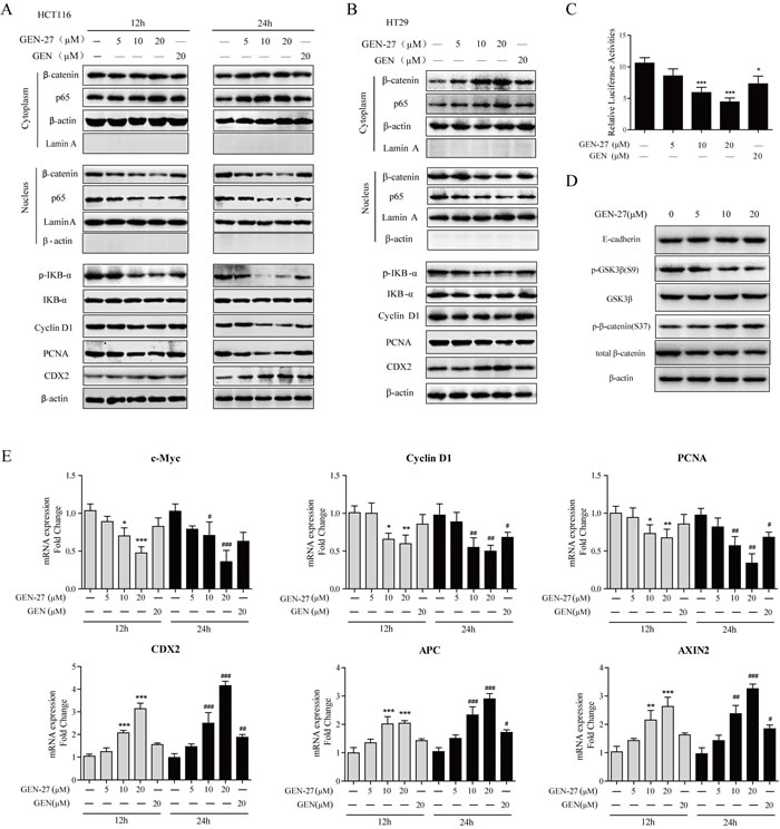 Figure 2: GEN-27 inhibits β-catenin activity in human colorectal tumor cells. A., B., D. NF-κB/p65, β-catenin nuclear translocation and protein levels of p-IκB-α, IκB-α, Cyclin D1, PCNA, CDX2, E-cadherin, p-GSK3β (S9), GSK3β, p-β-catenin (S37) and total β-catenin were determined by western blot. Data shown are representative of 3 experiments. C. Effects of the indicated concentrations of GEN-27 and GEN (20μM) on β-catenin transcriptional activity of HCT116 cells. TOP- or FOP-flash luciferase plasmid was co-transfected into HCT116 with renilla luciferase plasmid. Luciferase activity was divided by renilla activity. Results are quoted as relative values vs the control value and plotted as mean ± SD (n = 3). E. The mRNA expressions of c-Myc, Cyclin D1, PCNA, CDX2, APC and AXIN2 in HCT116 cells from each group were determined by Real-time PCR. Values are expressed as mean ± SD (n = 5). *P < 0.05, **P < 0.01, ***P < 0.001 vs. control group at 12h, #P < 0.05, ##P < 0.01, ###P < 0.001 vs. control group at 24h. GEN, genistein; GEN-27, genistein-27.