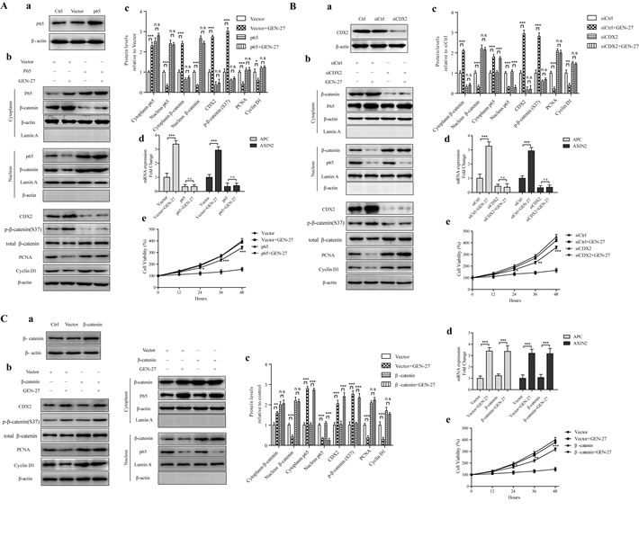 Figure 3: The p65-CDX2-β-catenin axis is responsible for the anti-proliferation effect of GEN-27 on HCT116 human colon cancer cells. (Aa, Ba, Ca) Protein levels of p65 (Aa), CDX2 (Ba) and β-catenin (Ca) with or without p65 overexpression A., CDX2 silencing B., β-catenin overexpression C. (Ab-c, Bb-c, Cb-c) NF-κB/p65, β-catenin nuclear translocation and protein levels of CDX2, p-β-catenin(S37), total β-catenin, PCNA, and Cyclin D1 were determined by western blot. Data shown are representative of 3 experiments. *P < 0.05, **P < 0.01,***P < 0.001. (Ad, Bd, Cc) Real-time qPCR analysis of APC and AXIN2 in HCT116 cells. Values are the mean ± SD (n = 5). (Ae, Be, Ce) Cell viability of HCT116 human colon cancer cells at the indicated time points from each group was analyzed by MTT assay. Each point represents mean ± SD (n = 5). *P < 0.05, **P < 0.01,***P < 0.001 vs. p65+GEN-27 group (Ad), siCDX2+GEN-27 group (Bd), or β-catenin+GEN-27 group (Cd). GEN, genistein; GEN-27, genistein-27.