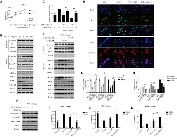 Figure 4: GEN-27 inhibits TNF-α-induced proliferation of human colon cancer cells. A. Effect of TNF-α on cell proliferation of HCT116 and HT29 human colon cancer cells. Cells were treated with various concentrations (1-50 ng/ml) of TNF-α for 24 hours, and cell viability was determined using MTT assay. Values were expressed as mean ± SD (n = 5). B. HCT116 cells were treated with 25 ng/ml TNF-α for the indicated times. Proteins were collected and NF-κB/p65, β-catenin nuclear translocation and protein levels of p-IκB-α, IκB-α, CDX2, Cyclin D1 and PCNA were determined by western blot. *P < 0.05, **P < 0.01,***P < 0.001 vs. control group. C. HCT116 cells were pre-treated with GEN-27 (20μM) and GEN (20 μM) for the indicated hours, and the effect of TNF-α (25 ng/ml, 6h) on β-catenin transcriptional activity was determined using TOP- or FOP-flash TOP/FOP-flash reporter system. Results are quoted as relative values vs the control value and plotted as mean ± SD (n = 3). D. HCT116 cells were incubated with GEN-27 (20 μM) and GEN (20 μM) for the 24 hours, and then treated with 25ng/ml TNF-α for 6 hours. NF-kB/p65 and β-catenin nuclear translocation were analyzed by immunofluorescence cytochemistry (scale bar, 25 μm). E., F. NF-κB/p65, β-catenin nuclear translocation and protein levels of p-IκB-α, IκB-α, CyclinD1, PCNA, CDX2, p-β-catenin (S37) and total β-catenin were determined by western blot. *P < 0.05, **P < 0.01,***P < 0.001 vs. the TNF-α group in (E); *P < 0.05, **P < 0.01,***P < 0.001 in (F). G., H. The mRNA expressions of CDX2, APC, AXIN2, c-Myc, Cyclin D1 and PCNA in HCT116 cells from each group were determined by Real-time PCR. Values are expressed as mean ± SD (n = 5). I.-K. Chromatin immunoprecipitation (ChIP) using a p65 antibody (I) or CDX2 antibody (J and K) and negative control IgG antibody in HCT116 cells treated with the indicated factors. Immunoprecipitates were probed with primer pairs located within the CDX2 silencer (I), APC enhancer (J) or AXIN2 (K) enhancer region and analyzed by Real-time PCR. Values are shown as percentage of total input DNA and are represented as mean ± SD (n = 3). *P < 0.05, **P < 0.01,***P < 0.001 vs. the TNF-α group; #P < 0.05, ##P < 0.01, ###P < 0.001. GEN, genistein; GEN-27, genistein-27.