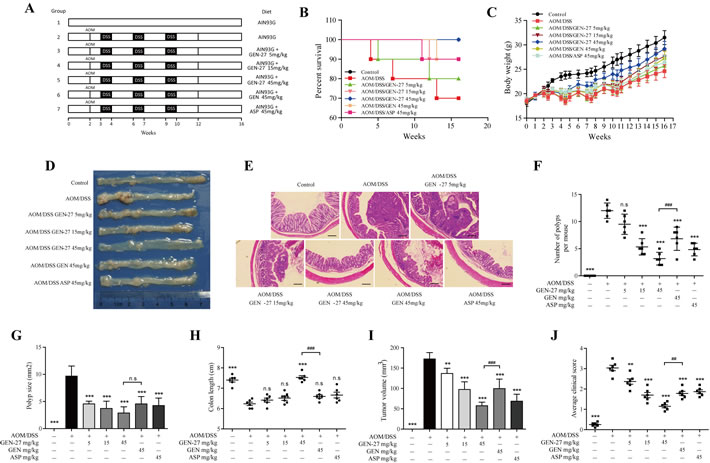 Figure 5: GEN-27 prevents colitis-associated tumorigenesis. A. Induction procedure and groups designed for the AOM/DSS model of CAC (n = 10). B. Survival rate. C. Body weight. D. Representative images. E. H&E staining (scale bar, 100 μm). F. Number of polyps per mouse. G. Polyp size. H. Colon length. I. The tumor volume was determined by totaling the volume of all tumors for a given animal. J. Average clinical score of colons. Clinical parameters (weight loss, stool consistency, bleeding) of indicated mice. Values are mean ± SD (n = 6). *P < 0.05,**P < 0.01,***P < 0.001 vs. AOM+DSS group. #P < 0.05, ##P < 0.01, ###P < 0.001. GEN, genistein; GEN-27, genistein-27; ASP, aspirin.