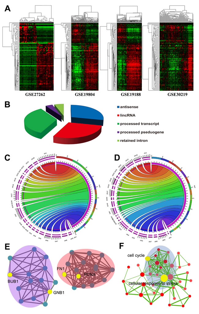 Figure 2: Expression heapmap of lncRNAs in the 4 datasets A. The left panels are LUAD samples and right panels are normal samples. Differentially expressed lncRNAs showed similar expression pattern in the 4 datasets. Biotypes of differentially expressed lncRNAs identified B. Distribution of upregulated lncRNAs C. and downregulated lncRNAs D. according to chromosome location. GREAT analyses found many differential lncRNAs are located nearby important cancer associated coding genes E. and they may be involved in various biological processes F. Each node indicates a cancer associated protein-coding gene E. of a GO biological process item F.
