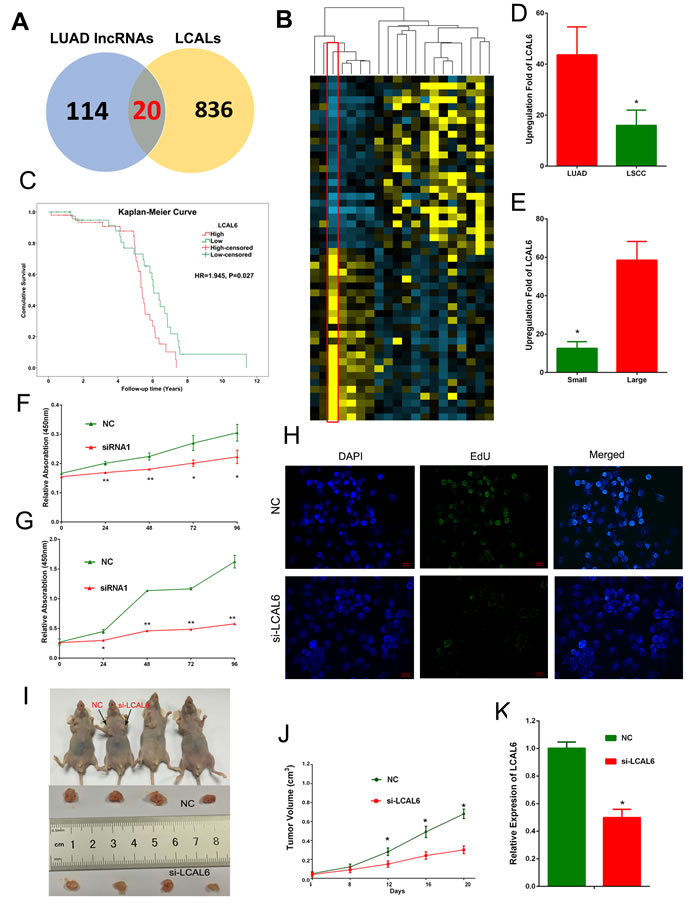 Figure 3: 20 lncRNAs were shared by our analyses and LCALs A. Expression heatmap of the 20 lncRNAs in the GSE27262 dataset B. High expression level of LCAL6 indicates poor prognosis of LUAD patients (C, HR = 1.945, 95% CI: 1.081-3.501, P = 0.027,). In an expression cohort of NSCLC patients, LCAL6 level was higher D. in LUAD compared with LSCC and higher in patients with larger tumor size E. CCK8 assay (F, A549 cells; G, H1299 cells) and EdU (H, A549 cell) assay showed that silence of LCAL6 by siRNA inhibited LUAD cells proliferation. In the xenograft tumor models, silence of LCAL6 inhibited xenograft tumor growth in vivo (I);J, tumor volume; K: tumor weight.