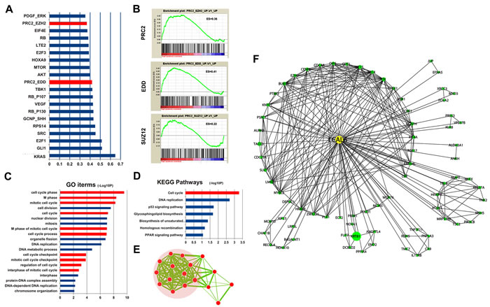 Figure 5: GSEA found PRC2 gene signatures were enriched for LCAL6. A., B. Functional annotation found the genes of PRC2 signatures enriched with LCAL6 were associated with cell cycle C., D., E. A LCAL6-centered regulatory network was proposed according to GSEA and coexpression analysis F..