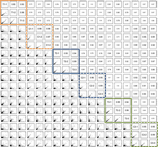 Figure 1: Pair-wise correlation of three tumor (T1-T3) / tissue pairs (C1-C3) that have been measured in technical triplicates. Triplicates of tumors are enclosed in solid boxes and of control tissue in dashed boxes. Upper triangle matrix presents the Pearson correlation coefficient, lower triangle matrix thumbnail scatter plots.
