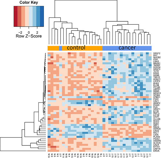 Figure 2A: Cluster heat map of 20 most differentially abundant proteins. The heat map shows a clear separation of lung cancer samples on the right hand side and control samples on the left side.