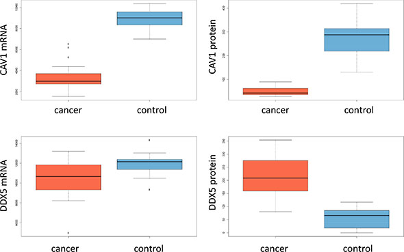 Figure 3: Box-plots for mRNA expression and protein abundance in cancer and controls for CAV1 and DDX5.
