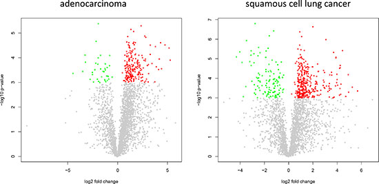 Figure 4: Volcano plots for adenocarcinoma and SCC. The plots present log2 of the fold change versus negative decimal logarithm of the p-value. Red data points correspond to up-regulated and green data points to down regulated proteins.