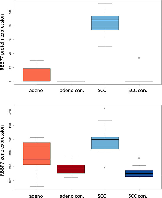 Figure 6C: Expression of RBB7 in adenocarcinoma, SCC and respective controls in mRNA and proteins are presented. For mRNA and protein expression, SCC have the highest levels among the four groups.