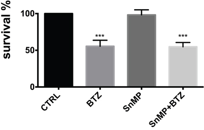 Figure 3: Cell viability following treatment with BTZ (15 nM for 24h) alone or in combination with SnMP (10 μM). Results are presented as percentage of the control. (***p<0.0001 vs untreated control). All values are mean ± SE of four experiments in duplicate.