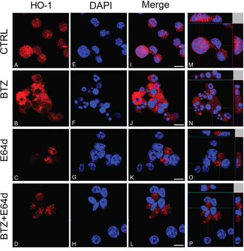 Figure 4: CLSM analysis of HO-1 localization in untreated U266 cell cultures (A, E, I, M) and following BTZ (15 nM for 24h) treatment alone (B, F, J, N) and/or in combination with E64d (20 μM) (C, G, K, O; and D, H, L, P). HO-1 detection was performed by incubation with anti-rabbit monoclonal antibody followed by secondary antibody conjugated to TRITC (red). Counterstaining of cells was performed by using the nuclear dye, DAPI (blue). The photographs result from sequential analysis of the same microscopic field, followed by merging of different images with specific staining. (Scale bars 10μm).