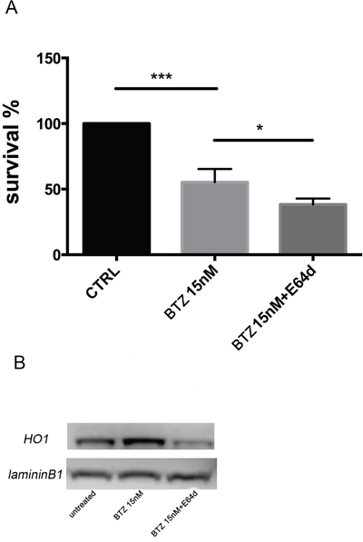 Figure 6: A. Cell viability following BTZ (15 nM for 24h) treatment alone or in combination with E64d (20 μM). Results are presented as percentage of the control. (*p<0.05 vs BTZ alone; ***p<0.0001 vs untreated control). All values are mean ± SE of four experiments in duplicate. B. HO-1 nuclear protein levels in U266 cell cultures treated with BTZ (15 nM for 24h) treatment alone or in combination with E64d (20 μM). Laminin b1 shows equal amount of nuclear protein loading in all lanes.
