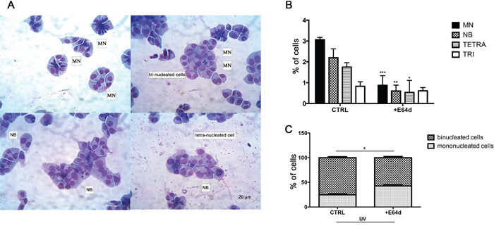 Figure 7: A. Representative images showing micronuclei in binucleated cells following Giemsa staining. B. Quantification (CBMN assay) of binucleated cells containing micronuclei (MN), nuclear bridge (NB), tetra (TETRA) and trinucleation (TRI). Results were obtained in untreated U266 cell cultures and following E64d (20 μM); C. Quantification of binucleated/mononucleated cells (CBPI). Results were obtained in untreated U266 cell cultures and after E64d (20 μM) following exposure to UV light. All values are mean ± SE of four experiments in duplicate. Percentage of cells were calculated over a 1000 counted cells.