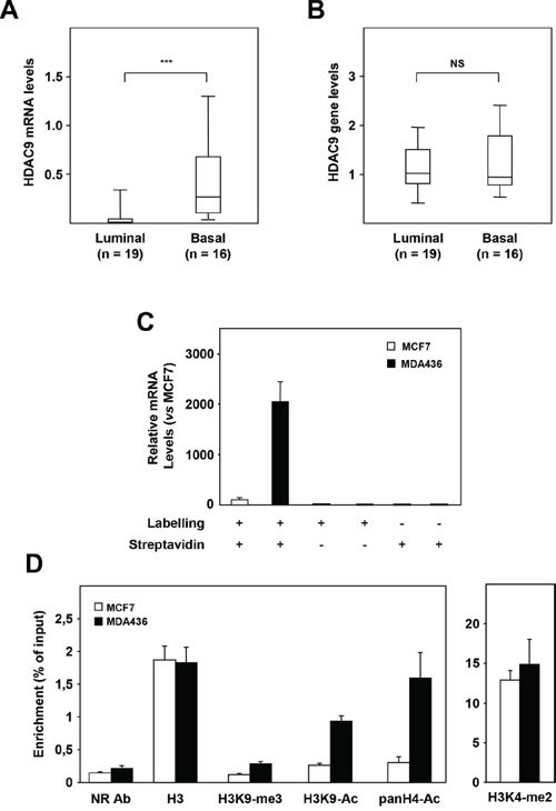 Figure 2: Mechanisms of HDAC9 deregulation in basal breast tumor cells. A. HDAC9 mRNA levels were measured in luminal (n=19) and basal (n=16) breast tumor cell lines using RT-qPCR as described in Materials and Methods. B. Same as in panel A for HDAC9 gene levels measured by qPCR. C. HDAC9 transcription rates were measured in MCF7 and MDA-MB436 breast tumor cells in a run-on experiment. HDAC9 mRNA levels are expressed relative to the MCF7 cell line used as reference. The various experimental conditions used for both cell lines are indicated. D. ChIP experiments on the HDAC9 gene promoter after immunoprecipitation using antibodies against Histone H3 (H3), H3K9-me3, H3K9-Ac, panH4-Ac, H3K4-me2 or an irrelevant antibody (NR Ab).*** p < 0.001.