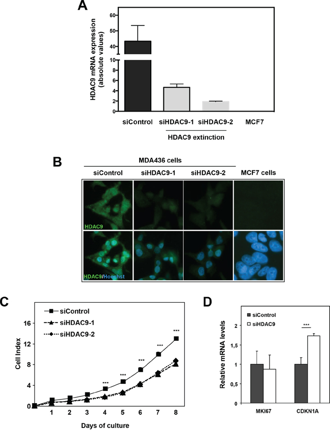 Figure 4: Effect of HDAC9 knock-down on breast cancer cell proliferation. A. HDAC9 expression was measured by RT-qPCR in MDA-MB436 cells after silencing (siHDAC9-1 and siHDAC9-2) or not (siControl) of the HDAC9 gene. Values represent fold changes ± SD corrected by the 28S mRNA and normalized to control cells. B. The same MDA-MB436 cells were analyzed by immunofluorescence using the anti-HDAC9 antibody. C. Cell index corresponding to the number of MDA436-siControl and MDA436-siHDAC9-1/-2 viable cells were monitored every 24 hours during 8 days using the xCELLigence system. Values are means ± SD, n=3 independent experiments. D. Ki67 and p21 mRNA levels were quantified using RT-QPCR. Results are expressed relative to the mRNA levels measured for the MDA436-siControl cells. *** p< 0.001.