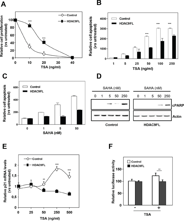 Figure 5: HDAC9 increases the resistance of breast cancer cells to HDIs. A. MCF7-Control and MCF7-HDAC9FL were treated with increasing concentrations of TSA (up to 40 ng/ml) or with solvent alone (Control) and viable cells were monitored using the xCELLigence system during 72 hours. Values are means ± SD, n=3 independent experiments. B. MCF7-Control and MCF7-HDAC9FL were treated with increasing concentrations of TSA (up to 250 ng/ml) or with solvent alone (Control) and apoptosis was measured using the Cell Death Detection ELISA kit. Results are expressed as arbitrary units, normalized to Control and represent mean ± SD of 4 wells; n=3 independent experiments. C. Same as in panel B with SAHA treatment. D. Total proteins were extracted from MCF7-Control and MCF7-HDAC9FL cells treated with increasing concentrations of SAHA (up to 250nM) and analyzed by western-blot using anti-cleaved PARP antibody. Actin was used as a loading control. E. Total RNA was extracted from stably transfected MCF7 cells treated or not by TSA and p21 mRNA levels were quantified using RT-qPCR. Results represent mean and SD of 3 independent cell cultures and are expressed relative to the p21 mRNA levels of the not treated cells, used as reference. F. MCF7-Control and MCF7-HDAC9FL were transfected with the p21 promoter luciferase reporter plasmid and treated or not by TSA (ng/ml). Results represent the luciferase activity measured after normalization for renilla luciferase activity and relative to the values obtained in the untreated MCF7-Control. Data represent mean ± SD of triplicates and are representative of 2 independent experiments. ** p< 0.01; ***p< 0.001.