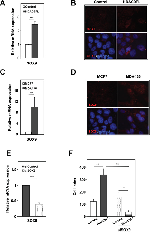 Figure 6: SOX9 is a target gene of HDAC9 in breast cancer cells. A. SOX9 mRNA levels were quantified in MCF7-Control (Control) and MCF7-HDAC9FL (HDA9FL) cells using RT-qPCR. Results represent fold change ± SD of 6 independent cell cultures vs levels in MCF7-Control cells after normalization to 28S mRNA. B. Results were confirmed by immunofluorescence analysis using anti-SOX9 antibody. C and D. Same as in panel A and B, respectively in MCF7 and MDA-MB436 wild-type cells. E. SOX9 mRNA levels was measured by RT-qPCR in MCF7-Control cells after silencing (siSOX9) or not (siControl) of the SOX9 gene. Results are expressed relative to the SOX9 mRNA levels of the MCF7-Control cells and represent mean ± SD of 3 independent cell cultures. F. MCF7-Control and MCF7-HDAC9FL viable cells, after silencing or not of the SOX9 gene, were monitoring using the XCELLigence system during 72 hours. Values are normalized to the MCF7-Control cells and are means ± SD, n=3 independent experiments.