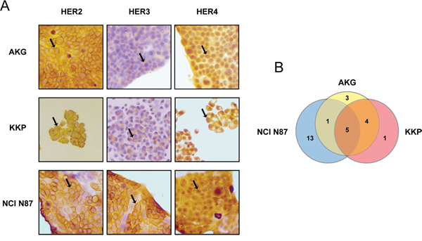 Figure 1: Baseline expression and mutational status of HER2, -3 and -4 receptors in a panel of established human gastric cancer cell lines. A. HER2, HER3 and HER4 staining by IHC in gastric cancer cell lines AKG, KKP and NCI N87. Sample reactivity was evaluated by light microscopy (×200 magnification) by two independent observers. Marker positivity was evaluated in a semiquantitative manner, as described in the Materials and Methods section. B. Venn-diagram comparison of gene variants across the three cell lines. The numbers refer to the number of somatic mutations affecting HER2, -3 and -4.