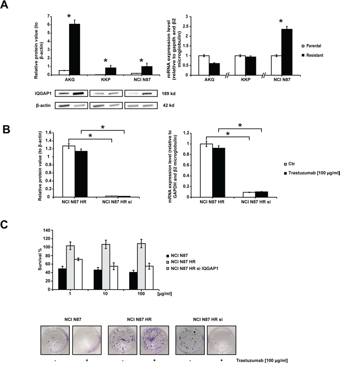A recent study reported that IQGAP1, a scaffold protein of 189-kDa ubiquitously expressed in all human tissues, governs HER2 expression, phosphorylation and signaling in breast cancer cell lines [32]. Moreover, IQGAP1 protein is overexpressed in squamous cell [33] and hepatocellular [34] carcinoma, astrocytoma [35], and aggressive forms of gastric cancer [36]. In particular, White et al. [37] showed that IQGAP1overexpression is correlated with trastuzumab-induced resistance in breast cancer cell lines. However, its involvement in resistance to trastuzumab in gastric cancer has never been investigated. In the present work we investigated mechanisms of resistance induced by trastuzumab in in vitro experimental gastric cancer cell lines rendered resistant to the antiproliferative effect of the drug.