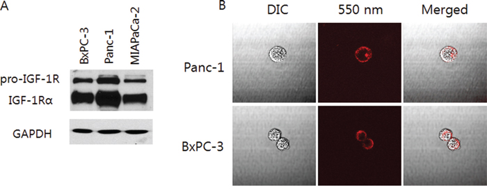 Western blotting showed Panc-1, BxPC-3, and MIA PaCa-2 pancreatic cancer cell lines expressed IGF-1R (Figure 1A). After incubation with the fluorophore-conjugated IGF-1R antibody, without permeation, multiple fluorescent foci were visualized on the membrane of Panc-1 and BxPC-3 cells under fluorescence microscopy (Figure 1B) confirming the expression of IGF-1R on cancer cells.
