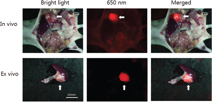 To make subcutaneously-transplanted pancreatic tumor models, Panc-1, BxPC-3, and MIA PaCa-2 human pancreatic cancer cells (2 × 106) were injected subcutaneously into the flanks of nude mice. When the subcutaneous tumors grew between 10 and 20 mm in diameter, imaging of the subcutaneous tumor was performed. To make orthotopic-tumor mouse models, subcutaneous tumors were harvested and divided into small fragments which were implanted onto the tail of the pancreas using 8-0 nylon sutures in nude mice, as previously described [37-40].