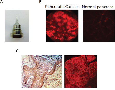 Figure 4: Ex-vivo microscopic imaging of an orthotopic pancreatic tumor labeled with fluorescent anti-IGF-1R antibody. A. Microprobe lens (x20) used with the IV-100. B. Ex vivo imaging done with the IV-100 visualized fluorescence from the surface of BxPC-3 cancer cells in the orthotopic tumor with anti-IGF-1R conjugated to a 650 nm DyLight dye. C. H & E and fluorescence staining of a tissue sample (x200) confirm the specific expression of IGF-1R on the surface of the pancreatic cancer cells.