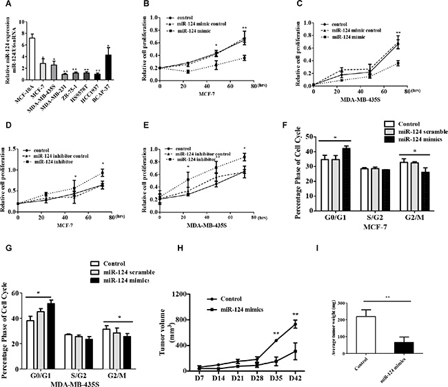 Figure 2: miR-124 inhibits breast cancer cell proliferation and induces cell cycle arrest in vivo and vitro. (A) miR-124 expression levels were analyzed in different breast cell lines by qRT-PCR, and U6 snRNA was treated as internal control. (B, C) MTT detected miR-124 mimic effect on breast cancer cell proliferation. (D, E) MTT measured miR-124 inhibitor effect on breast cancer cell proliferation. Cell cycle profile was examined by flow cytometry with propidium iodide staining, and the cell number was counted according to DNA content of G0/G1, S and G2/M phases. (F) MCF-7, (G) MDA-MB-435S. (H) Tumor growth curves measured after injection of MCF-7 cells stably transfected with miR-124 mimic or control. The tumor volume was calculated every 7 days. (I) The tumor mass was determined when the mice was sacrificed. The data are shown as the mean ± SD from three independent experiments with similar results. *p < 0.05, **p < 0.01.