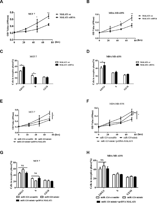 Figure 4: MALAT1 reverses the inhibitory effect of miR-124 on cell proliferation and cell cycle in breast cancer cells in vitro. (A, B) Cell proliferation was assayed in MALAT1-sc- and MALAT1-siRNA- transfected MCF-7 and MDA-MB-453S cells by MTT at 0 h, 24 h, 48 h and 72 h. (C, G) MCF-7. (D, H) MDA-MB-435S. Cell cycle profile was examined by flow cytometry with propidium iodide staining, and the cell number was counted according to DNA content of G0/G1, S and G2/M phases. (E, F) Cell proliferation was assayed in miR-124 scramble, miR-124 mimic and miR-124 mimic + pcDNA-MALAT1 transfected MCF-7 and MDA-MB-453S cells by MTT at 0 h, 24 h, 48 h and 72 h. The data are shown as the mean ± SD from three independent experiments. *p < 0.05, **p < 0.01, NS, No significant difference.