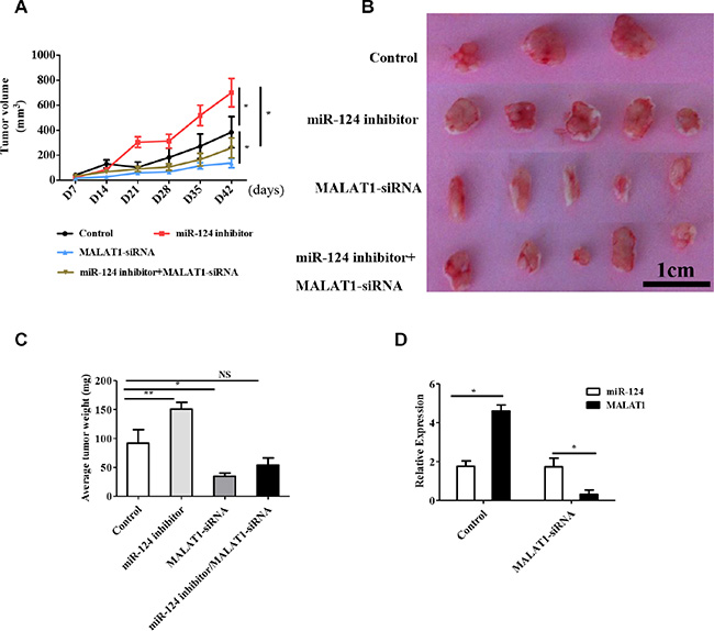 Figure 5: MALAT1 regulates tumor growth through miR-124 in vivo. (A)Tumor growth curves measured after injection of MCF-7 cells stably transfected with MALAT1-siRNA, miR-124 inhibitor, miR-124 inhibitor+MALAT1-siRNA and PBS as the control. The tumor volume was calculated every 7 days. (B, C) The tumor mass was determined when the mice were sacrificed. (D) qRT-PCR detected miR-124 and MALAT1 expression in tumor tissues from the control group and MALAT1-siRNA group. The data are shown as the mean ± SD from MALAT1-siRNA (n = 5), miR-124 inhibitor (n = 5), miR-124 inhibitor+MALAT1-siRNA (n = 5) and PBS as the control (n = 3) from three independent experiments with similar results. *p < 0.05, **p < 0.01, NS, No significant difference.