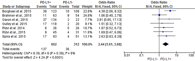 Figure 2: Forest plot showing odds ratio for overall response rate to anti-PD-1/PD-L1 monoclonal antibodies according to the tumor PD-L1 expression status, in pre-treated NSCLC patients.