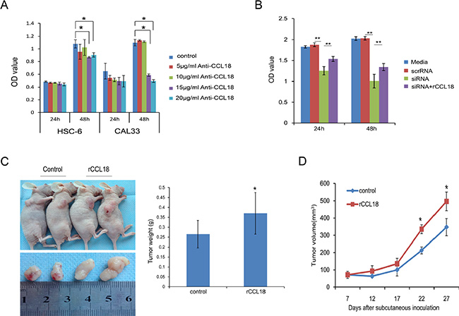 Figure 3: CCL18 promotes oral cancer cell growth in vitro and in vivo. (A) OSCC cells (HSC-6 and CAL33) were treated with the indicated concentration of neutralizing CCL18 antibody (anti-CCL18). Cell viability was then measured using the CCK-8 assay at 24 h and 48 h. The data are presented as the mean ± SEM of triplicate experiments. (*P < 0.05) (B) HSC-6 cells were left untreated, transfected with 20 nM scrRNA, transfected with 20 nM siCCL18, or transfected with 20 nM siCCL18 and then treated with 20 ng/ml exogenous rCCL18 (siCCL18+rCCL18). Following treatment, cell viability was measured at 24 h and 48 h. The data are presented as the mean ± SEM of triplicate experiments (**P < 0.01). (C and D) Representative images of tumors obtained after subcutaneous injection of HSC6 cells into the flank region of nude mice, and treatment (3 times/week × 3 weeks) with vehicle control (n = 5) or exogenous rCCL18 (n = 6, 2 ng/g) starting on the 7th day. Tumor volumes were measured once every 5 days starting at the beginning of treatment. Four weeks after HSC-6 injection, the mice were sacrificed and the tumors were removed and weighed. Tumor weights (C) and volumes (D) are presented as the mean ± SEM. (*P < 0.05 vs. control).