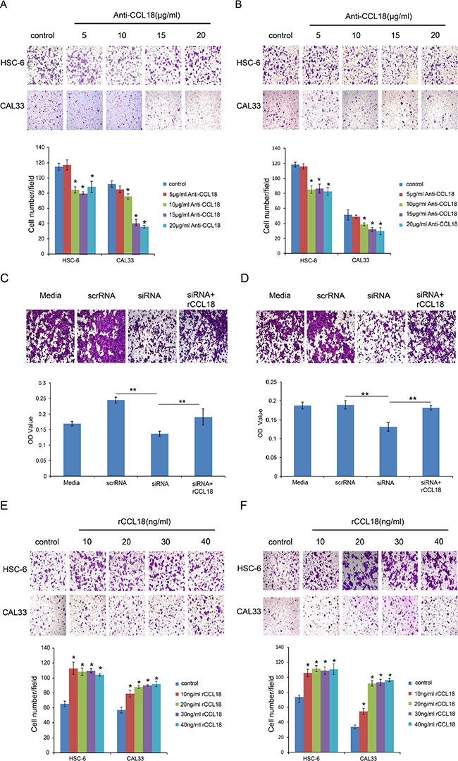 Figure 4: CCL18 enhances OSCC cell migration and invasion. (A and B) The migration and invasion abilities of HSC-6 and CAL33 cells treated with the indicated concentrations of anti-CCL18 were evaluated by transwell migration and invasion assays. Representative pictures and the mean number of cells that migrated (A) or invaded (B) to the lower surface of three independent experiments (± SEM) are shown. (*P < 0.05 vs. control) (C and D) The migration and invasion abilities of HSC-6 cells were measured by transwell assay after the following treatments: transfection with 20 nM scrRNA, transfection with 20 nM siCCL18, or transfection with 20 nM siCCL18 and treatment with 20 ng/ml exogenous rCCL18 (siCCL18 + rCCL18). Representative pictures are shown and the mean OD values (± SEM) of migratory (C) or invasive (D) cells were measured at 590 nm. (*P < 0.05, **P < 0.01). (E and F) The migration and invasion abilities of HSC-6 and CAL33 cells treated with the indicated concentrations of exogenous rCCL18 were evaluated. Representative pictures and the mean number of migrated (E) or invaded (F) cells of three independent experiments (± SEM) are shown. (*P < 0.05 vs. control).