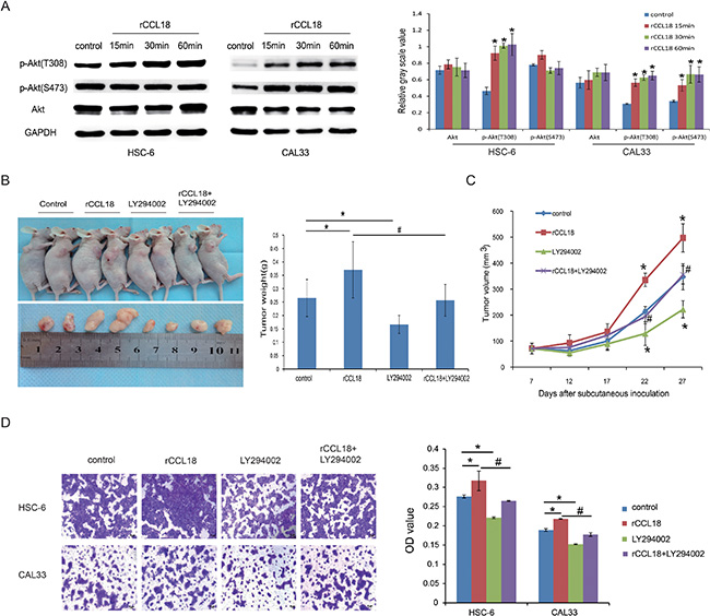 Figure 5: CCL18 activates Akt signaling in oral cancer cells. (A) HSC6 and CAL33 cells were treated with 20 ng/ml exogenous rCCL18 for 15 min, 30 min, and 60 min. The cells were then harvested for western blotting to detect total and phosphorylated Akt (p-Akt) proteins. Densitometry was used to determine p-Akt/GAPDH and Akt/GAPDH ratios. Data represent mean ± SEM of three independent experiments. (*P < 0.05 vs. cells without treatment) (B and C) HSC-6 xenografts were treated (3 times/week × 3 weeks) with vehicle control (n = 5), rCCL18 (n = 6, 2 ng/g), LY294002 (n = 6, 100 ug/g) or their combination (n = 6, rCCL18+LY294002) starting on the same day of grouping. Tumor volumes were then measured once every 5 days. At the end of 3 weeks of treatment, the mice were sacrificed and the tumors were removed and weighed. Tumor weights (B) and volumes (C) are presented as the mean ± SEM. (*P < 0.05 vs. control, #P < 0.05 vs. rCCL18 group) (D) Invasion abilities of HSC-6 and CAL33 cells after treatment with vehicle control, 20 ng/ml rCCL18, 10 μmol/L LY294002, or their combination (rCCL18+LY294002) were evaluated. Representative pictures and the mean invaded cell numbers of three independent experiments (± SEM) are shown. (*P < 0.05 vs. control, #P < 0.05 vs. rCCL18 group).