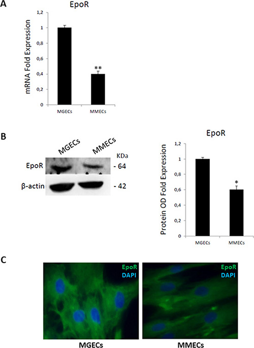 Figure 2: Bone marrow endothelial cells express Epo receptor. (A) mRNA levels are analyzed by Real Time RT PCR and normalized to GAPDH; fold increase of mRNA in MGECs versus MMECs as mean ± SD of 6 MGUS and 8 MM patients. (B) Western blot of representative MGECs and MMECs (left); fold increase of optical density (OD) in MGECs versus MMECs as mean ± SD of 8 MGUS and 12 MM patients (right). Significances *P < 0.03 and **P < 0.003 by Wilcoxon signed-rank test. (C) Immunofluorescence for Epo-R (green signal) and nuclei (blue signal) in ECs from representative MGUS and MM patients. Merge show more cell surface expression of Epo-R in MGECs versus MMECs. Left panel: merged picture of Epo-R and nuclei in MGECs; right panel: merged picture of Epo-R and nuclei in MMECs. Pictures acquired by an Axioplan-2 microscope. Original magnification 40X.