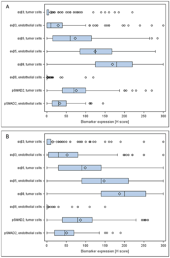 In order to maximize the statistical power, the univariate prognostic value of the biomarkers was assessed in the whole cohort. No significant association of integrin expression in tumor or endothelial cells with outcome was revealed in either trial cohort. Similarly, no prognostic role for pSMAD2 levels became apparent (Supplementary Table S3 and S4).