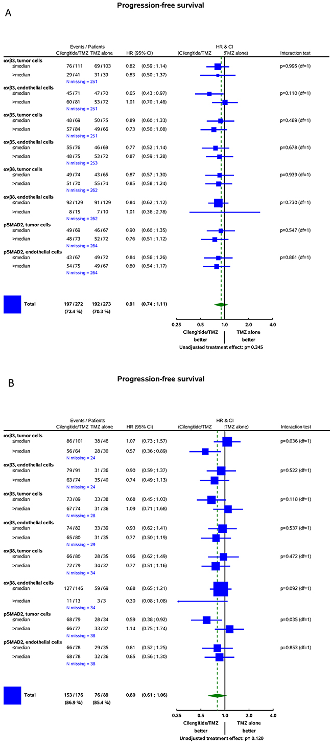 Figure 4: Forest plots: predictive value of biomarkers for the efficacy of cilengitide for PFS assessed by central review. A. CENTRIC. B. CORE. On the left-hand, the integrin subgroups with numbers of events/sample size by treatment arm, number of missing data, and hazard ratios (HR) with 95% confidence intervals are shown. The vertical line represents the absence of differential effects between the two treatments, i.e., if for an integrin subgroup, the 95% confidence intervals overlap with this line, it indicates that treatment effects are not different. The square represents the Cilengitide/TMZ hazard ratio in the integrin subgroup. The area of each square is proportional to the number of events. The diamond indicates a differential effect of treatment in the whole cohort. Diamond overlapping the vertical lines indicates in-significantly different treatment effects at 5% significance. On the right-hand, interaction tests are presented. They assess the significance of a differential treatment effect between two integrin subgroups, i.e., tests have one degree of freedom (df=1).