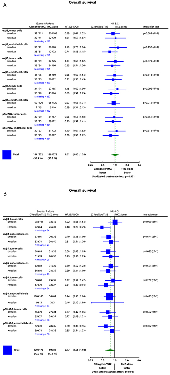 Figure 5: Forest plots: predictive value of biomarkers for the efficacy of cilengitide for OS. A. CENTRIC B. CORE (for detailed explanations, see Figure 4).