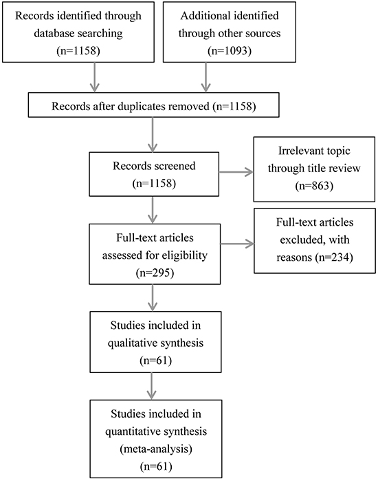 Our initial search yielded 1158 potential literature citations. Of these, 863 were excluded after scanning titles and abstracts, leaving 295 citations for full-text assessment. Of the 295, 61 studies met the inclusion criteria and were used for this meta-analysis. The remaining studies were excluded largely because of the following reasons: (I) reported data regarding clinicopathological features was not stratified by PD-L1 status, (II) the data was reported in an unsuitable format and therefore unable to be compared to the others studies, or (III) they included data that overlapped with other studies. (Figure 1)