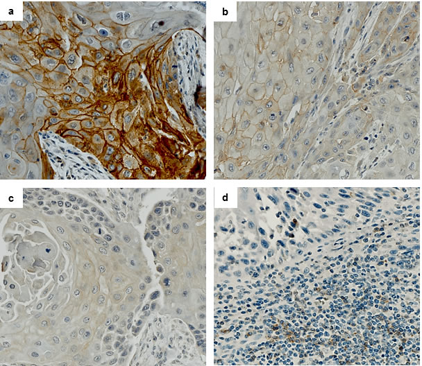 Figure 1: Squamous cell carcinoma of the head and neck, showing membraneous PD-L1 expression in tumor cells with a. strong staining (3+), b. intermediate staining (2+) and c. weak staining (1+) intensity. Fibroblasts within tumor stroma are negative. d) PD-1 staining in squamous cell carcinoma with intermingled tumor-infiltrating lymphocytes (TILs). PD-1 staining is only seen in TILs, while carcinoma cells are negative. (a.-c. PD-L1 immunohistochemistry, d. PD-1 immunohistochemistry).
