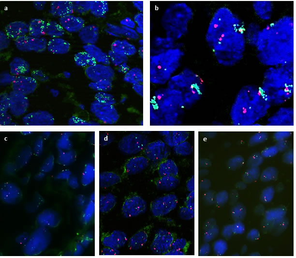 Figure 3: Fluorescence in situ-hybridization (FISH) for PD-L1. PD-L1 gene is labelled in green, centromer 9 in red. FISH analysis showing a., b. high level amplification, with PD-L1/CEP9 ratio ≥ 4, indicated by clusters of green fluorochrome labeling PD-L1 c. low level amplification, PD-L1/CEP9 ratio ≥ 2.0 - < 4; d. Polysomy of PD-L1 gene locus; e. PD-L1 disomy. (a.-d. SPEC CD274, PDCD1LG2/CEN9 Dual Color Probe).