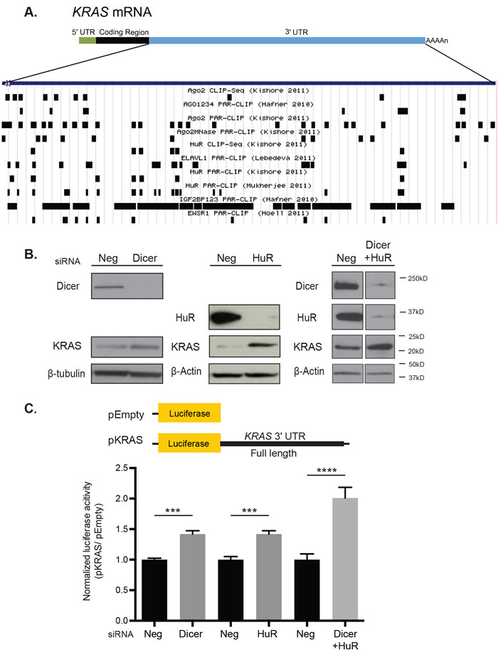 Figure 1: HuR and miRNAs potentially regulate KRAS through its 3′ UTR in HeLa cells. A. Validated RBP binding sites from the DoRiNA database were aligned to the complete sequence of the 3′ UTR of KRAS transcript variant B using the UCSC Genome Browser. Only a select list of RBPs, including AGO2, HuR, IGF2BP1, 2 and 3, and EWSR1, are included in the figure. B. Western blot analysis showed an increase in KRAS protein level following siRNA-directed knock-down for Dicer and HuR individually and in combination in HeLa cells compared with negative control (Neg). β-tubulin and β-Actin were used as loading controls. C. Luciferase reporter assays showed an increase in the normalized pKRAS reporter expression with si-HuR and si-Dicer treatment compared with si-Neg treatment. pKRAS contains the full length KRAS 3′ UTR in the psiCHECK-2 dual luciferase vector. pEmpty is a psiCHECK-2 alone with no insert. The expression of pKRAS was normalized to that of pEmpty with each siRNA treatment. A representative of three independent experiments is shown in mean ± S.D. ***: p-value < 0.001, ****: p-value < 0.0001.