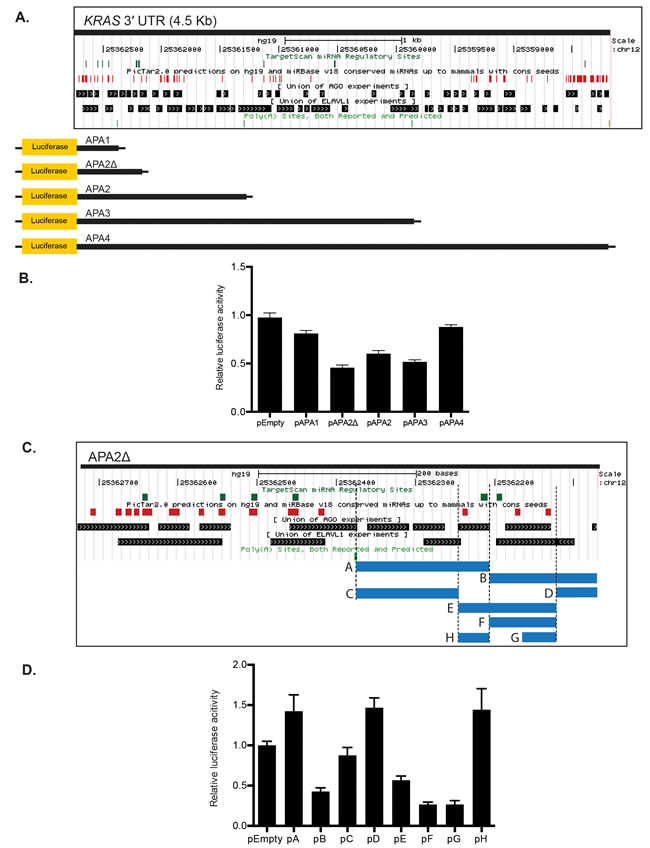 Figure 2: The KRAS 3′ UTR contains multiple stabilizing and inhibitory elements. A. The UCSC Genome Browser was utilized to align potential miRNA binding sites, and AGO2 and HuR binding sites within the KRAS 3′ UTR. Truncated KRAS 3′ UTR luciferase reporter constructs contained varying lengths of the 3′ UTR corresponding to predicted alternative polyadenylation (APA) sites. miRNA binding sites were predicted using TargetScan and PicTar. B. The luciferase reporter expression of each construct was normalized to pEmpty. Luciferase reporter assays showed a trend for greater reporter repression with constructs containing longer KRAS 3′ UTR fragments, except for two reporters: pAPA4 and pAPA2Δ. pAPA4, which contains the full length KRAS 3′ UTR, showed a minimal repression, while pAPA2Δ showed the greatest repression. C. The 300-bp KRAS 3′ UTR fragment in pAPA2Δ that is not part of pAPA1 was further dissected based on the presence of potential binding sites corresponding to miRNAs and AGO2 and HuR (or ELAVL1) binding sites. miRNA predictions from TargetScan and PicTar, and the union of AGO2- and HuR- CLIP experiments from the DoRiNa database are included in the figure. These smaller fragments indicated by the blue bars were fused to psiCHECK-2 to generate 8 luciferase reporter constructs. The regulatory factors that bind to the fragment H (chr12: 25362194-25362242 in GRCh37/hg19) include miR-181 and miR-1197 predicted by PicTar and TargetScan and AGO2, FMR1, FOX2, IGF2BP1-3, and PTB predicted by DoRiNA and StarBaseV2. miRanda, miRDB, PicTar, PITA and TargetScan predict miR-29a, miR-185, miR-186, miR-548n, miR-577, miR-587 and miR-1275 binding sites and dbRBP, DoRiNA and StarBaseV2 predict AGO2, EWSR1, HuR, IGF2BP1-3, LIN28A and TTP binding sites in the fragment G (chr12: 25362099-25362147). D. Luciferase reporter assays revealed multiple stabilizing and inhibitory regions within the 300 bp fragment of pAPA2Δ. Of note, pH exhibited robust reporter expression, while pG exhibited a robust reporter repression compared with pEmpty. A representative of at least three independent experiments is shown in mean ± S.D. in B. and D.