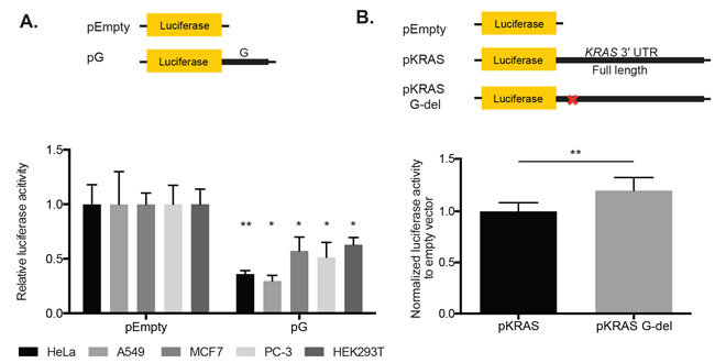 Figure 3: The 49-nt fragment G in the KRAS 3′ UTR contains a repressive element that is required for luciferase reporter repression in HeLa cells. A. The pG reporter construct, containing the 49-nt fragment G alone, showed luciferase reporter repression in HeLa, A549, MCF7, PC-3, and HeK293T cells. Expression was normalized to pEmpty. B. Deletion of the fragment G sequence from the KRAS 3′ UTR (pKRAS G-del) resulted in a modest but statistically significant reporter de-repression compared with pKRAS, which contained the full length KRAS 3′ UTR. p-value = 0.0021. A representative of two and at least three independent experiments are shown in mean ± S.D. in A. and B. respectively. *: p-value <0.05, **: p-value <0.01.