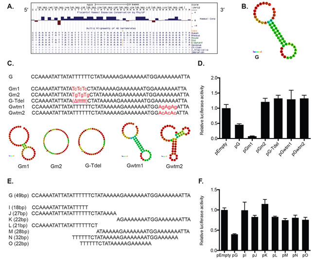 Figure 4: The full sequence of the 49-nt fragment G is required for luciferase reporter repression in HeLa cells. A. A detailed survey of the 49-nt fragment G sequence revealed conserved A and U rich regions. The UCSC Genome Browser was utilized to examine the conservation across different vertebrate species. B. RNAfold software revealed a hairpin secondary structure for the fragment G. The color represents base-pair probabilities for each paired or unpaired bases. Blue denotes a possibility of 0 and red a possibility of 1. C. A series of substitution mutations were introduced within conserved A and U rich regions of the fragment G. pGm1 and pGm2 constructs were generated by mutating alternating Ts to Cs (Gm1) or Ts to Gs (Gm2). In construct pG-Tdel, the stretch of 5′ conserved Ts was deleted completely from the fragment. Gwtm1 mutated alternating As to Gs, and Gwtm2 mutated alternating As to Cs. RNAfold predicted that the original hairpin structure of fragment G was disrupted by all mutations except for the Gwtm1. D. Luciferase assays revealed that the T-to-G sequence mutation (pGm2), deletion of the conserved 5′ Ts (pG-Tdel), and mutations of the conserved 3′ As (pGwtm1 and pGwtm2) resulted in de-repression compared to the original G sequence. The T-to-C sequence mutation (pGm1) exhibited enhanced repression compared with unmutated fragment G (pG). E. Further truncation of the fragment G was performed to generate seven additional smaller fragments that were cloned into psiCHECK-2. F. All reporters containing the new smaller fragments exhibited a relief of the reporter repression initially observed in pG. A representative of at least three independent experiments is shown in mean ± S.D. in D. and F.