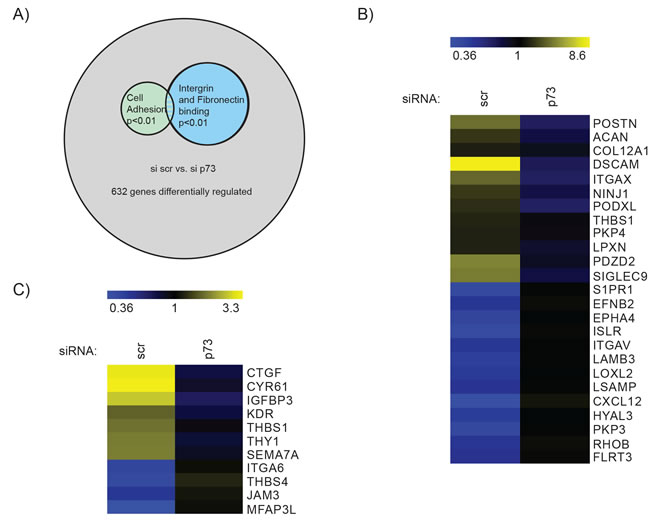 Figure 3: Analysis of mRNA expression after p73 knock down suggests a role for p73 in cell migration and invasion. A. Results of the microarray revealed 632 genes that were differentially expressed in control cells compared to knock down of endogenous p73 (Schematic illustration of gene array results). Pathway analysis of microarray results comparing U251 transfected with scr siRNA and p73 siRNA indicated changes in the pathways shown. Odds ratios for pathways are Integrin binding = 4.4, Fibronectin binding 9.05 and Cell adhesion = 2.04. p- values refer to the significance of enrichment of genes of the pathways shown. Heat maps of B. “Integrin and Fibronectin binding” (combined), 10 genes for integrin binding and 5 genes for fibronectin binding were identified, while CTGF is involved in both pathways. C. “Cell Adhesion” genes identified by GO term analysis, as differentially expressed between si scr and si p73.