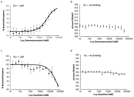 Initially, we performed blind molecular dockings with each 100 runs to predict binding energies of 10 antihistaminic compounds and two control drugs (promethazine and hydroxyzine) to human TCTP (Figure 1 and Table 1). Levomepromazine and buclizine showed the highest binding affinities and were therefore selected to study the interaction to human TCTP in more detail.