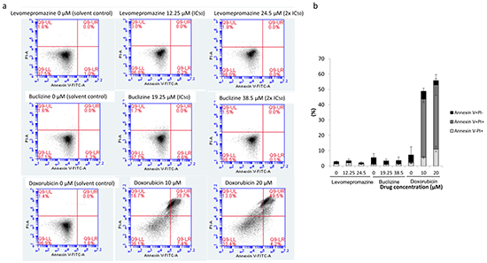 Cells were treated with IC50 and 2 × IC50 of levomepromazine and buclizine or with 10 μM and 20 μM doxorubicin for 72 h. Afterwards, cells were analyzed by annexin V-PI double staining (Bio Vision, Heidelberg, Germany). Annexin V is an intracellular protein that calcium-dependently binds to phosphatidylserine (PS), which translocates from the intracellular leaflet of the plasma membrane to the external leaflet during early apoptosis. Propidium iodide (PI) is excluded by living or early apoptotic cells with intact membranes and stains late apoptotic and necrotic cells with red fluorescence due to DNA intercalation. Therefore, cells with annexin V (-) and PI (-) are considered to be alive, while cells with annexin V (+) and PI (-) are in early apoptosis. Cells in late apoptosis or necrosis are both annexin V and PI positive. Briefly, MCF-7 cells were treated with various concentrations of levomepromazine, buclizine or doxorubicin for 72 h. After incubation, cells were collected by trypsination and centrifugation. After washing with medium, cells were incubated with annexin V and PI binding buffer (Bio Vision) according to the manufacturer’s protocol. Subsequently, 2 × 104 cells were counted and measured with Accuri™ C6 cytometer (BD Biosciences, Heidelberg, Germany). The annexin V-FITC signal was measured with 488 nm excitation and detected using a 530/30 nm band pass filter. The PI signal was analyzed with 561 nm excitation and detected using a 610/20 nm band pass filter. All parameters were plotted on a logarithmic scale. Cytographs were analyzed using BD Accuri C6 software (BD Biosciences).